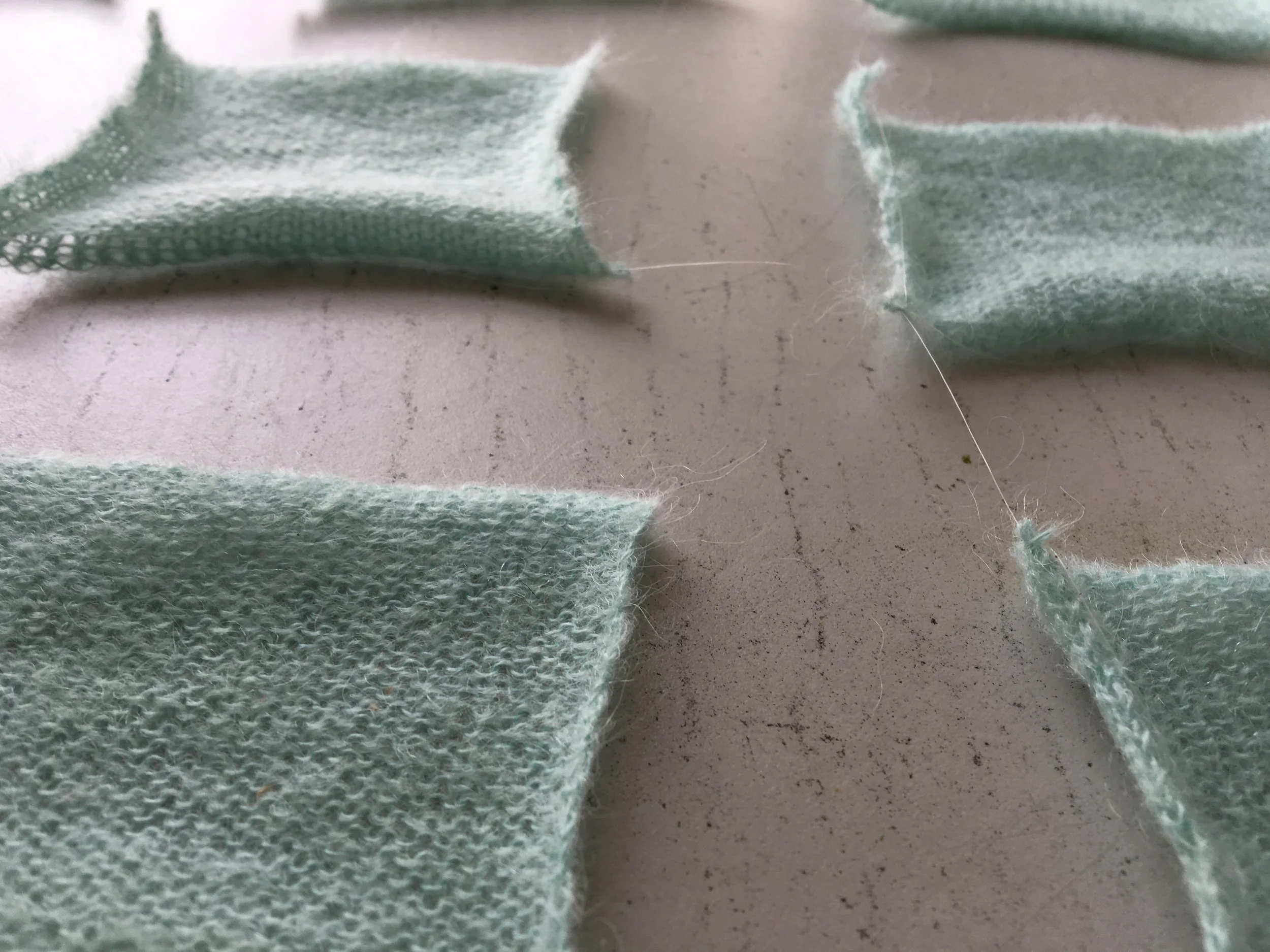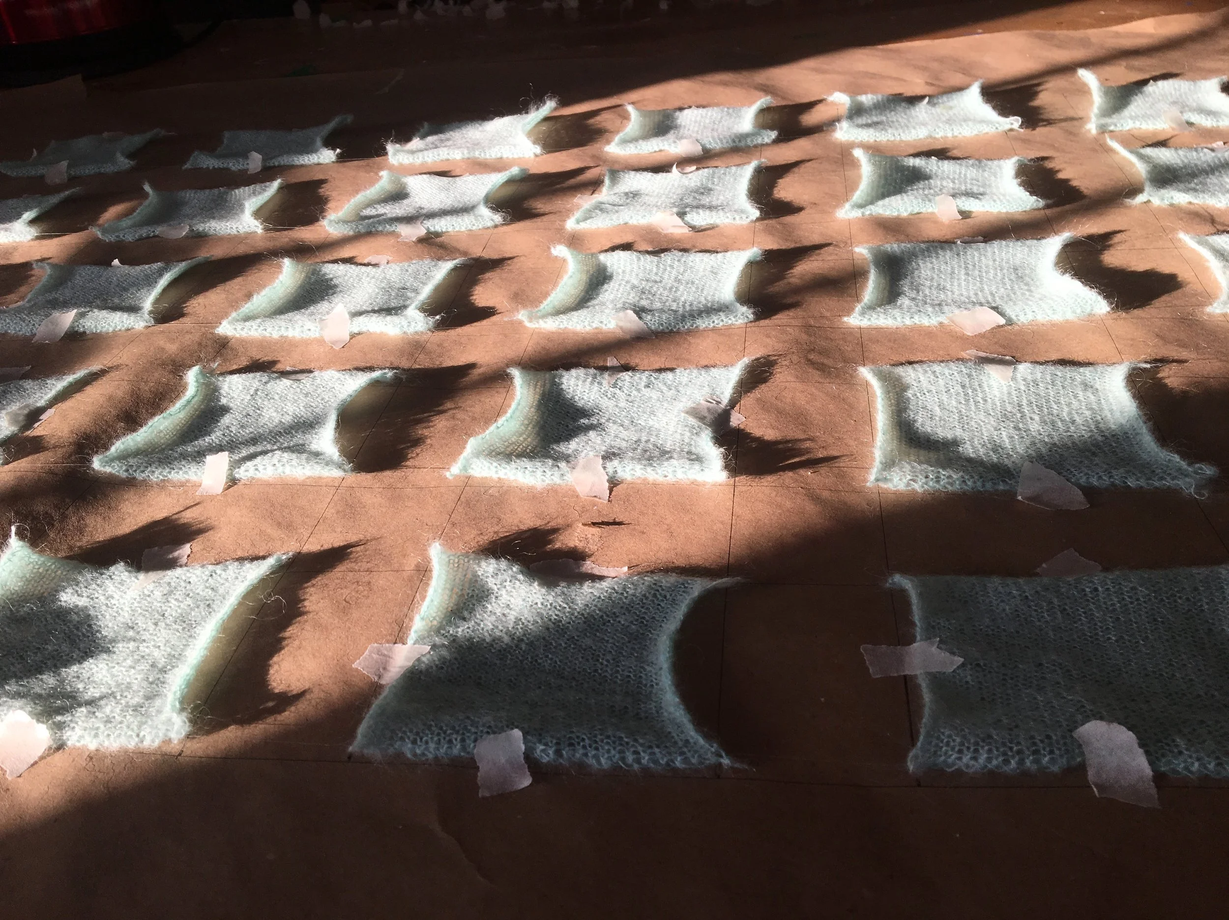 198 hand knit mohair squares tied together with 15 strands of monofilament